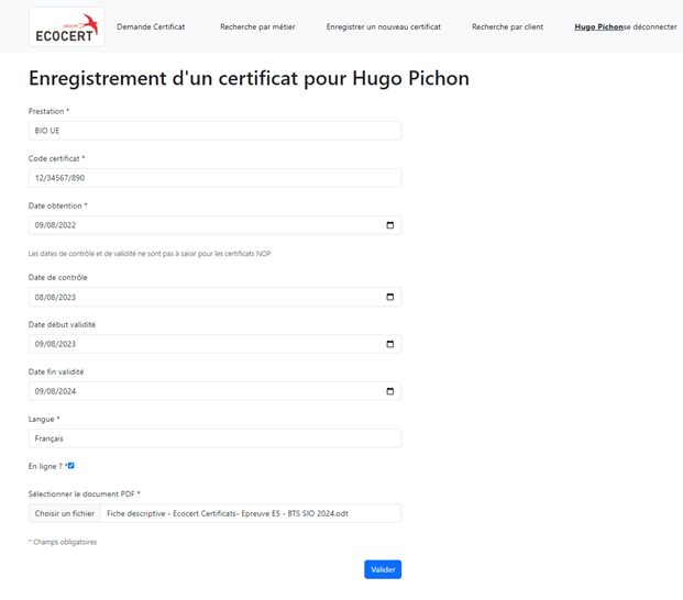 Après s’être authentifié, le salarié d’Ecocert accède au formulaire de saisie d’un certificat afin d’enregistrer un nouveau certificat.